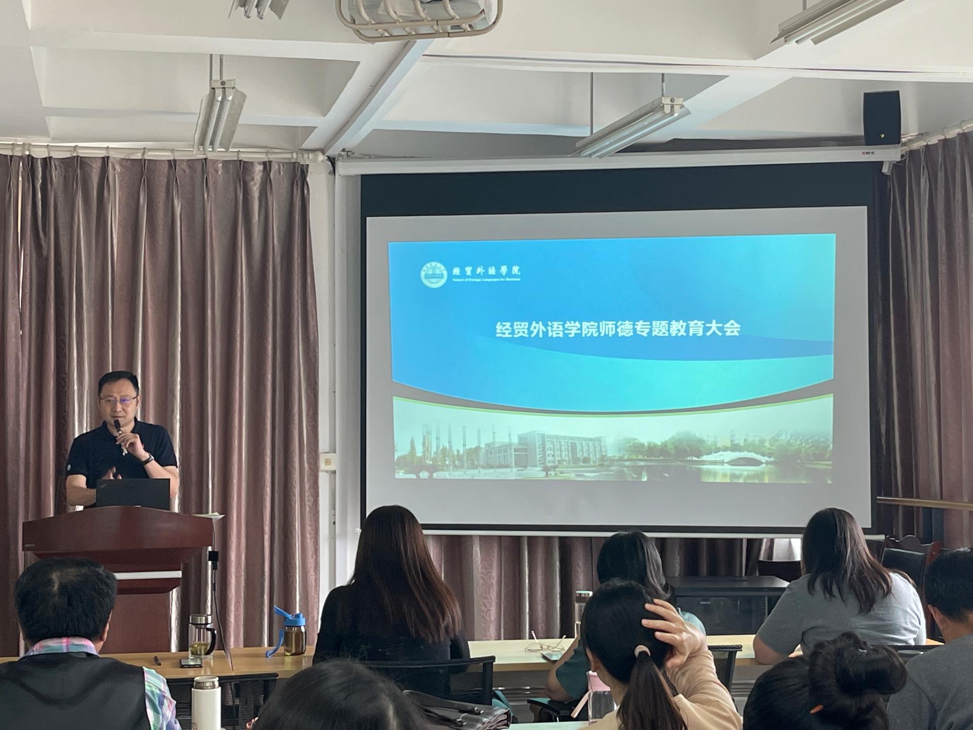 为进一步落实学院师德师风建设长效机制,切实加强教师职业道德建设和教师队伍管理,深入推进公司师德师风建设活动开展, 6月8日下午,经贸外语学院在通博楼C407召开师德专题教育大会,由张家瑞经理主持。